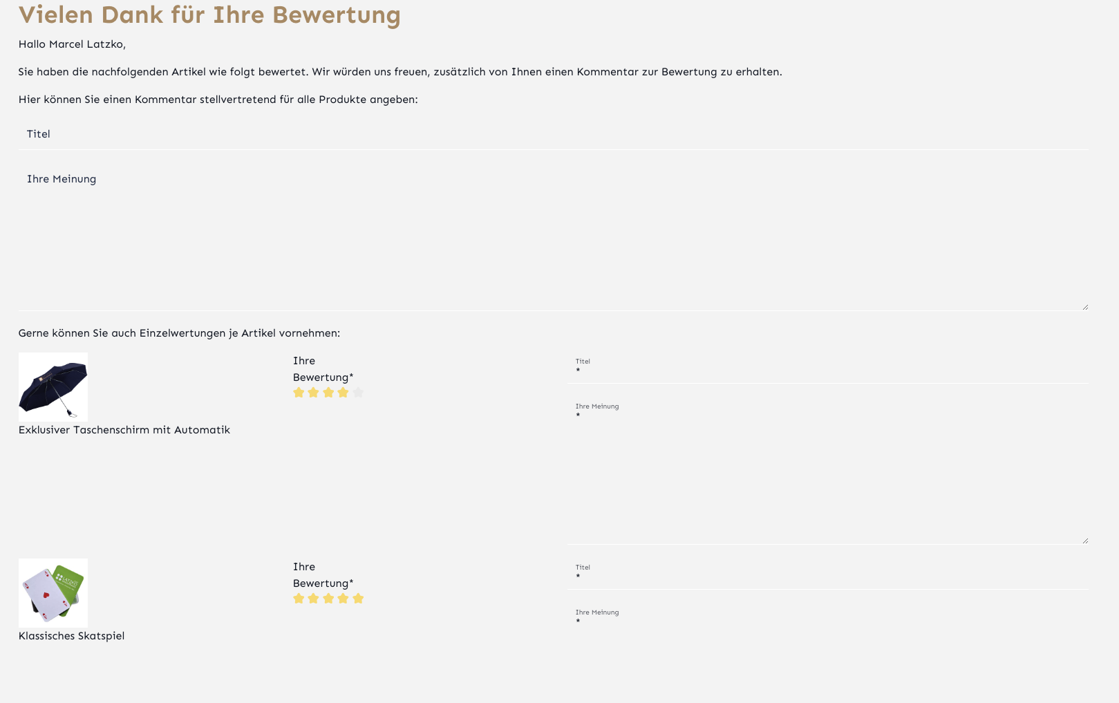 Mit dem Klick auf die Sterne in der Mail, ist die Bewertung bereits gespeichert. Optional kann der Kunde anschließend noch einen Text für die Bewertung hinterlassen oder seine Bewertung anpassen.